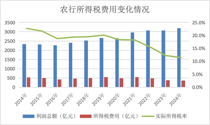 以农业银行为例 ,2014年-2024年间农业银行利润总额整体呈现稳步增长的态势,但在政府债扩张带来的免税效应下,其所得税费用不降反升 。2024年农行所得税费用365亿元 ,实际所得税率仅11.4%,实际税率相比2014年下降一半。