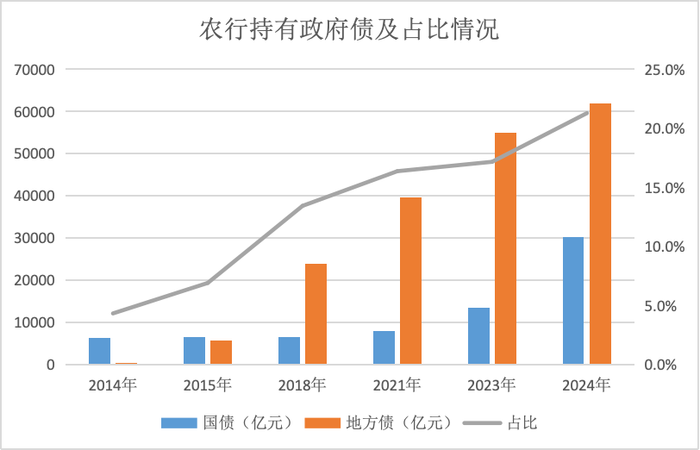 以农业银行为例,2014年末其政府债持仓不到0.7万亿 ,几乎没有持有地方债。但随着地方债置换进行,地方债持仓快速增加,国债持仓则在2020年后快速增长 ,至2024年末农行政府债持仓超9万亿,占总资产的比重达21.3%,相比2014年末增长了17个百分点。