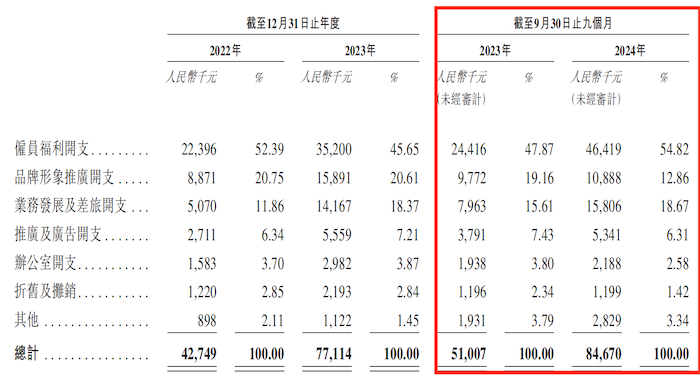 此外,2024年前三季度公司营销费用8467.0万元,同比爆增66.00%,其中 ,人力成本占比从47.87%提升至54.82%,开支同比激增90.12%;业务发展及差旅开支同比激增98.49%。