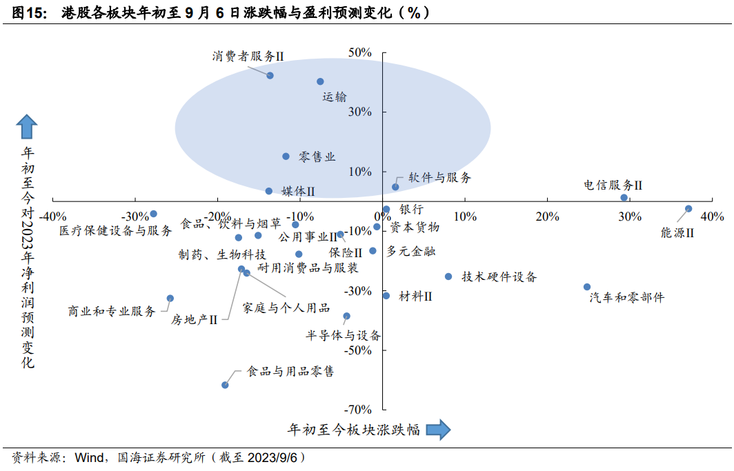 对此他们建议,关注消费者服务、运输、零售业、媒体 、软件服务配置机会。从年初至9月6日分别涨跌幅分别为-14%、-8%、-12% 、-14%、2%,而对2023年盈利预期分别上涨42%、40% 、15%、3%、5% 。