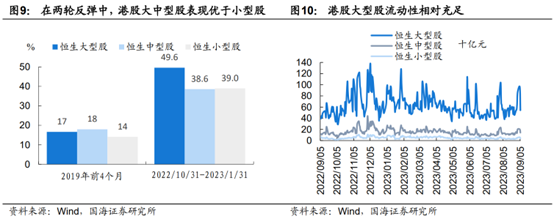 港股成长风格在这两轮反弹中表现均优于价值,大型、中型股表现优于小型股 。在2019年1-4月 ,港股成长 、价值板块分别上涨21%、13%,而在2022/10/31-2023/1/31,港股成长、价值分别上涨54% 、24% ,可见在反弹中成长板块弹性往往更大。从市值规模来看,在2019年1-4月,港股大型、中型、小型股票分别上涨17% 、18%、14% ,而在2022/10/31-2023/1/31分别上涨49.6%、38.6%、39%,大中型股票整体表现优于小型股,或因小型股长期流动性较不充足。