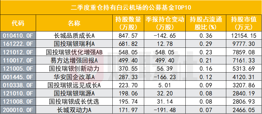具体来看,持仓最多是长城品质成长 ,持股数量为857.57万股,该基金还位列白云机场的第八大流通股东 。国投瑞银旗下的数只基金如国投瑞银瑞利、国投瑞银优化增强ab 、国投瑞银创新动力、国投瑞银远见成长等基金均重仓持有白云机场。