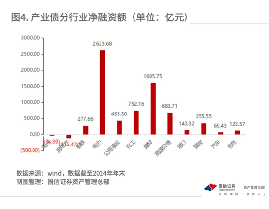 国信资管统计 ,2024年产业债发行约9.20万亿元,净融资额1.69万亿元,相比2022 、2023年供给和净融资额均有所放量 。其中非银金融、公用事业、交通运输 、建筑装饰、煤炭石油行业的债券发行量合计占比达2/3,净融资额占比约达72%。