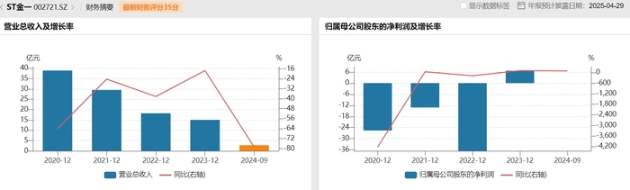 作为一家上市时间超十年的上市公司 ,st金一曾在2015至2018年间陆续收购越王珠宝等珠宝公司,还曾收购p2p网贷 、持牌小贷等相关资产。在不断并购的同时,st金一营收规模水涨船高 ,并在2017年创下1.82亿元的净利润高点。但之后,并购带来的商誉和负债暴雷让这家公司面临业绩巨亏,2020年至2022年净利润累计亏损达75.35亿元 ,2023年扣非净利润亏损6.93亿元,2024年预计扣非净利润亏损1200万元-800万元 。