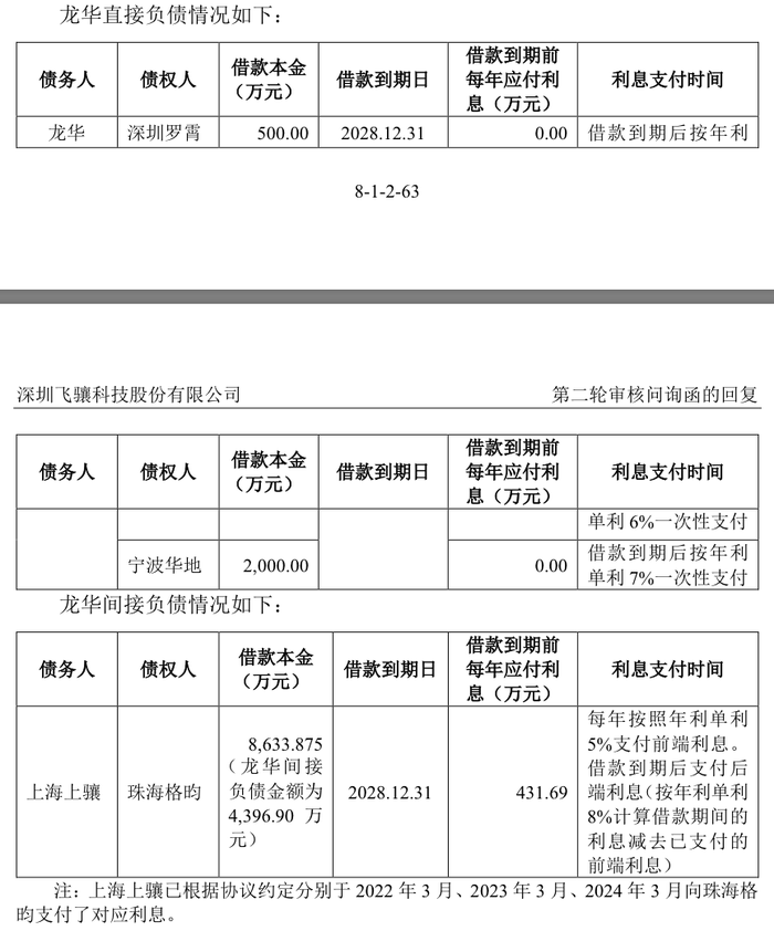 根据披露 ,飞骧科技实控人龙华个人直接大额负债 (单笔100万元以上)本金为2500万元,主要债权人为宁波华地和深圳罗霄;龙华通过上海上骧间接需承担的大额负债本金为4396.9万元,上海上骧的债权人为珠海格昀,前述借款主要用于受让飞骧科技股份或实缴对飞骧科技的出资。