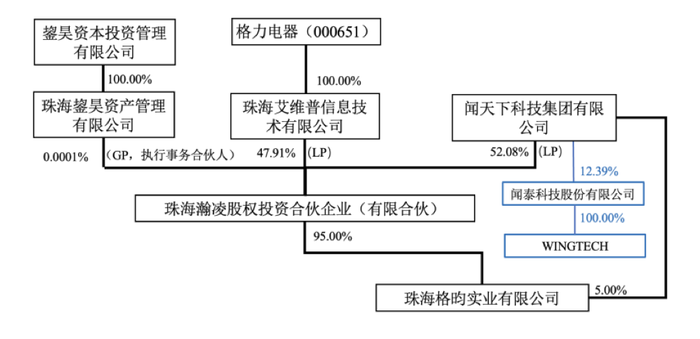 珠海瀚凌的gp是珠海鋆昊资产管理有限公司,独立决定处分合伙企业财产权利等重大事项,还有两个lp分别是闻泰科技控股股东(52.08%)和珠海艾维普信息技术有限公司(47.91%) ,后者被格力电器100%控制 。