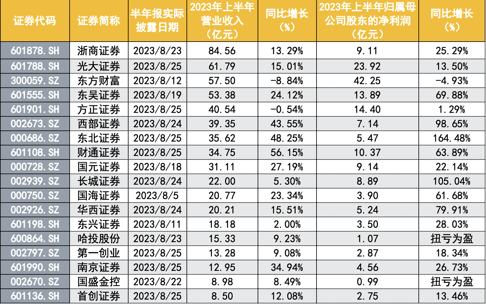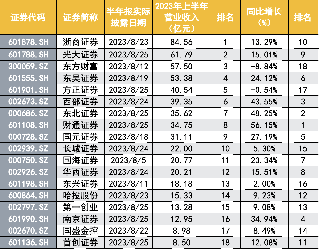 目前共有18家上市券商发布了半年报。其中 ,浙商证券上半年实现营收84.56亿元,光大证券、东方财富 、东吴证券营收业均超过50亿元 。