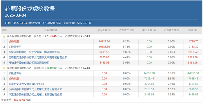 芯原股份(688521.sh)则获得了宁波桑田路和作手新一的携手买入,其中 ,国盛证券宁波桑田路以9011.52万元的买入额居于买方第三位;作手新一的常用席位国泰君安证券南京太平南路居于买方第四位,买入金额为7975.88万元。