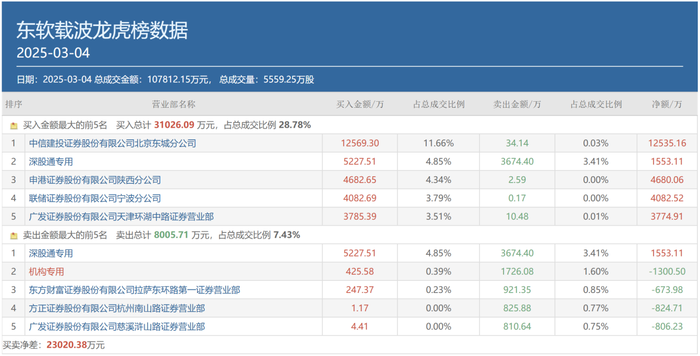 盘后披露的龙虎榜数据显示 ,东软载波(300183.sz)获知名游资呼家楼的青睐,其常用席位中信建投证券北京东城分公司出现在该股买方第一位,买入金额为1.26亿元 ,占该股当日总成交额的比例为11.66%;另有两个知名游资常用席位联储证券宁波分公司和广发证券天津环中湖路也分别买入该股4082.65万元和3785.39万元。