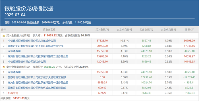 wind数据显示 ,当日共有20个营业部的龙虎榜成交金额超过了2亿元。其中,呼家楼的常用席位中信建投证券北京东城分公司成交金额为6.25亿元;一线游资常用席位国泰君安证券咸宁咸宁大道成交金额为5.3亿元;陈小群的常用席位中国银河证券大连黄河路的成交金额为2.82亿元;章盟主的两大常用席位国泰君安证券上海海阳西路和国泰君安证券上海江苏路成交金额分别为2.71亿元和2.69亿元。