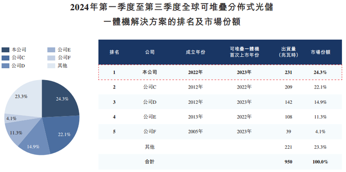 据弗若斯特沙利文报告,2024年前三季度 ,前五大可堆栈分布式光储一体机风云体育的解决方案公司占全球总出货量的76.7% 。按2024年前三季度的出货量来看,思格新能源为最大的可堆栈分布式光储一体机风云体育的解决方案公司,出货量为231兆瓦时,市场份额为24.3%。
