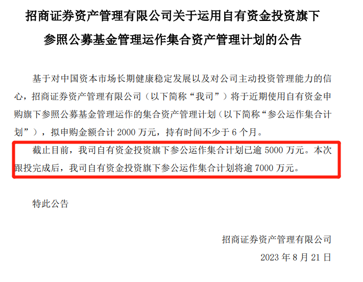 截止目前,招商证券资管自有资金投资旗下参公运作集合计划已逾5000万元。本次跟投完成后 ,公司自有资金投资旗下参公运作集合计划将逾7000万元 。