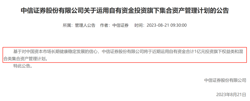 8月21日,中信证券公告,基于对中国资本市场长期健康稳定发展的信心 ,中信证券将于近期运用自有资金合计1亿元投资旗下权益类和混合类集合资产管理计划。