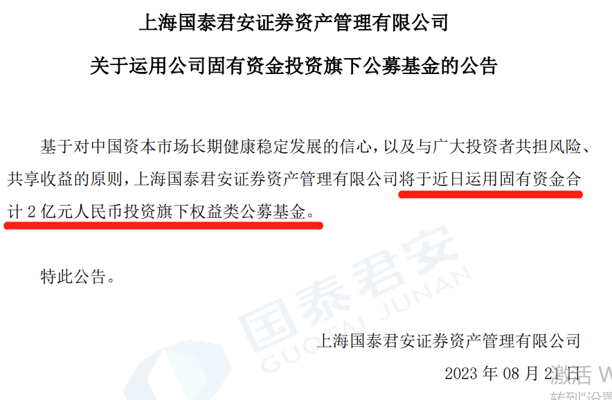 国泰君安资管同日发布公告,基于对中国资本市场长期健康稳定发展的信心,以及与广大投资者共担风险、共享收益的原则 ,上海国泰君安证券资产管理有限公司将于近日运用固有资金合计2亿元投资旗下权益类公募基金 。
