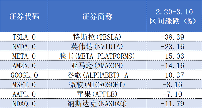 然而,近期以来美股持续走弱 ,科技股更是成为了“重灾区”,wind数据显示,自2月20日至3月10日纳斯达克指数区间跌幅高达11.79%,美股科技“七姐妹”同期股价也均有不同程度的下跌 ,其中英伟达股价区间跌幅为23.16% 。