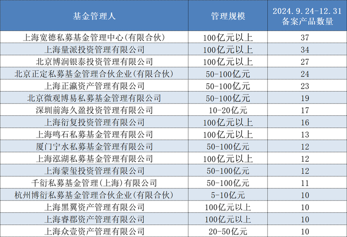 wind数据显示,自2024年9月24日至同年12月31日期间 ,上海宽德私募、量派投资、博润银泰投资 、正定私募等备案的产品数量分别达37只、34只、27只和24只,北京微观博易私募 、衍复投资、鸣石私募、蒙玺投资 、千衍私募、黑翼资产等头部量化私募同期备案的产品数量也都不少于10只。