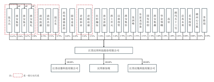 张大兵直接持有汉邦科技31.67%股份 ,为控股股东。另外,张大兵通过淮安集智、淮安集才和淮安集礼分别控制公司2.94% 、2.67%、1.30%股份,合计控制公司38.58%股份 ,为公司的实际控制人。