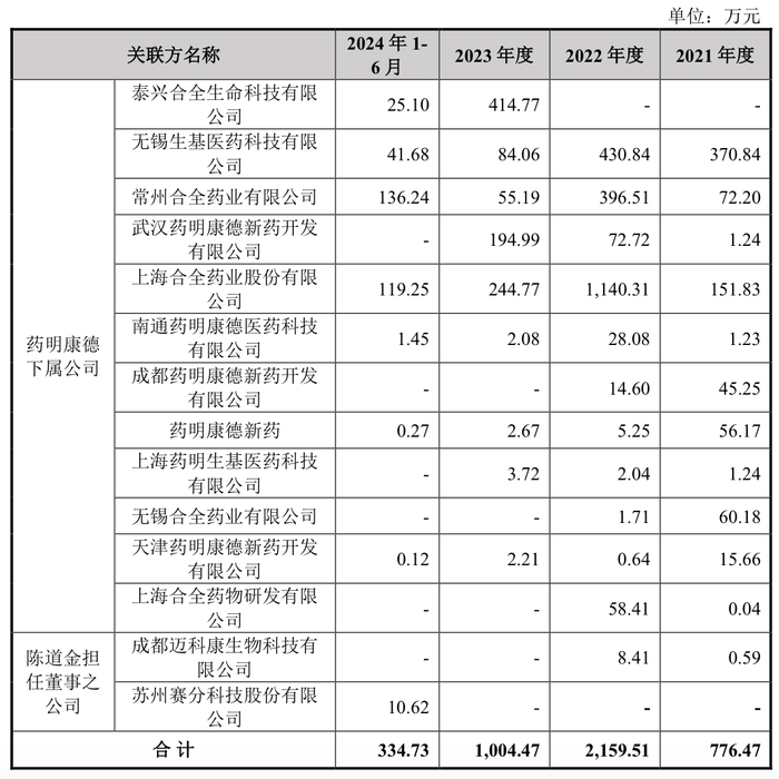 药明康德与汉邦科技亦有关联交易存在 。2021年至2024年1-6月,汉邦科技关联交易金额分别为776.47万元、2159.51万元、1004.47万元 、334.73万元 ,其中与药明康德系公司的关联交易金额分别为775.88万元、2151.1万元、1004.47万元 、324.11万元,占据绝对大头。
