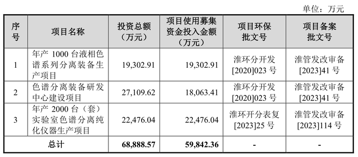 具体看,汉邦科技的募投,主要还是扩产和投研有关 ,“年产1000台液相色谱系列分离装备生产项目 ”和“年产2000台(套)实验室色谱分离纯化仪器生产项目”建设期均为2年,前者扩大生产级小分子液相色谱系统及大分子层析系统产能,后者扩大实验室液相色谱设备的生产投入和产能 。