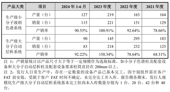 界面新闻注意到 ,汉邦科技在说明书中提及的产能利用率,是通过工时算的,2024年上半年的产能能利用率为86.5% ,无法直观看到产能对应台数。从产销看,2024年上半年公司生产级小分子液相色谱系统产量127台,产销率90.55%;生产级大分子自动层析系统产量90台 ,产销率92.22%。