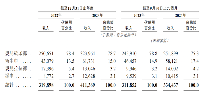 除婴儿纸尿裤外 ,卫生巾是乐舒适第二大产品,公司产品矩阵中还涵盖婴儿拉拉裤和湿巾等。报告期,纸尿裤以75%以上的收入占比位居第一,卫生巾收入占比13%以上 ,截至2024年9月30日增至17.4%,婴儿拉拉裤、湿巾收入规模相对较小 。