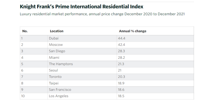 当然,早在俄乌冲突之前的2021年,迪拜已经成为豪宅王者。这不是没有道理的 。