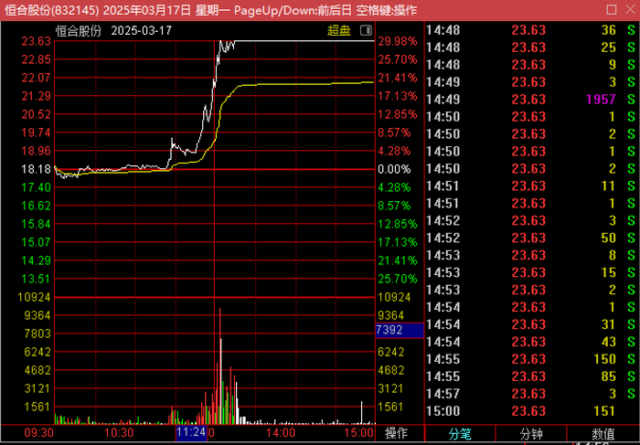 “中投风起扶摇五号”相关账户在13:00:46.97至13:01:35.25期间以22.48元/股至23.50元/股的价格买入成交恒合股份”11.86万股、274.68万元 ,期间买入成交占比达36.35%。