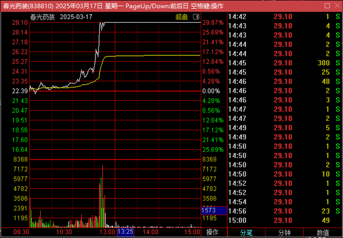 具体来看,该产品相关账户在11:06:43.58至11:08:30.06期间以26.26元/股至29.08元/股的价格买入成交春光药装30.70万股、860.11万元 ,期间买入成交占比达40.13%。