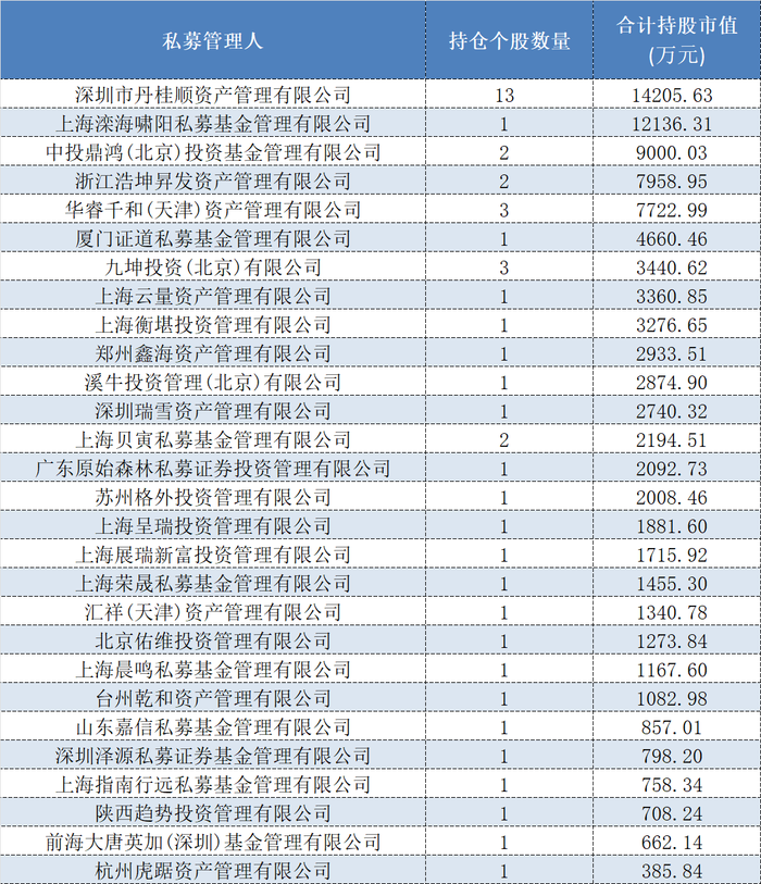 其他私募在北交所个股方面亦有所布局 。wind数据显示,截至2024年三季报时,共有28家私募旗下产品出现在36只北交所个股的前十大流通股东中 ,合计持仓总市值为9.47亿元。