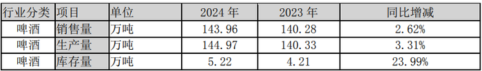国家统计局数据显示 ,2024年,中国啤酒行业规模以上企业完成啤酒产量3521.3万千升,同比下降0.6% 。