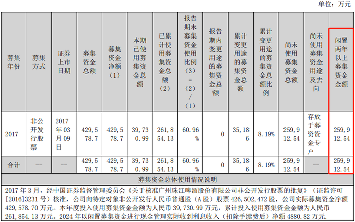 截至2024年末,珠江啤酒尚未使用的募资总额还有26亿元 ,占募资总额约40%;2023年末为29.48亿元。