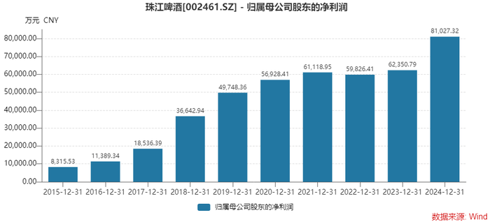 珠江啤酒2024年实现营业收入57.31亿元,同比增长6.65%;归母净利润8.10亿元,同比增长29.95%。两项指标双双创下历史新高 ,也优于行业整体表现 。