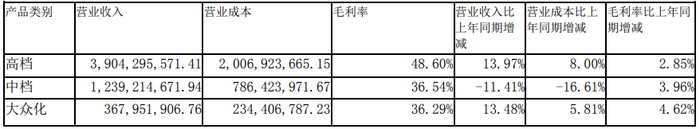其次为中档产品,去年取得了12.39亿元营收,同比下滑了超10% ,占比在两成左右。