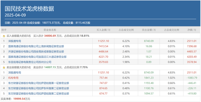 另外一只科技股国民技术(300077.sz)4月9日龙虎榜买方前五位中也出现了两个知名游资常用席位的“身影” ,分别是国泰海通证券上海新闸路和消闲派的常用席位国泰海通证券宜昌沿江大道,买入金额分别为7413.54万元和4221.7万元。