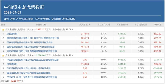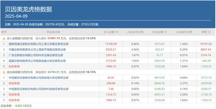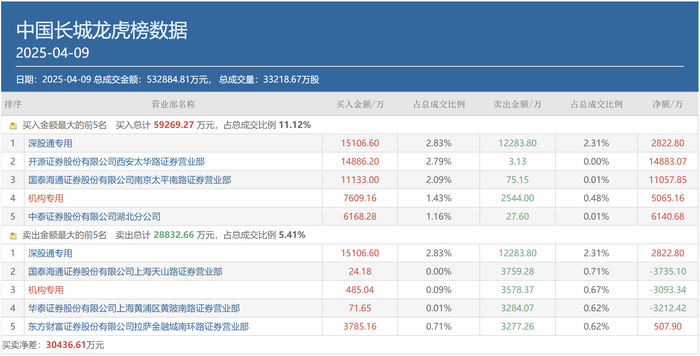 wind数据显示 ,4月9日当天共有25个营业部的龙虎榜成交金额超过了1亿元。其中,章盟主的常用席位国泰海通证券上海江苏路成交金额为3.03亿元;炒股养家的常用席位华鑫证券上海宛平南路成交金额为1.67亿元;作手新一的常用席位国泰海通证券南京太平南路成交金额为1.16亿元;另有国泰海通证券上海新闸路、国泰海通证券宜昌沿江大道、国泰海通证券上海松江中山东路等其他多个知名游资常用席位也都“榜上有名”。